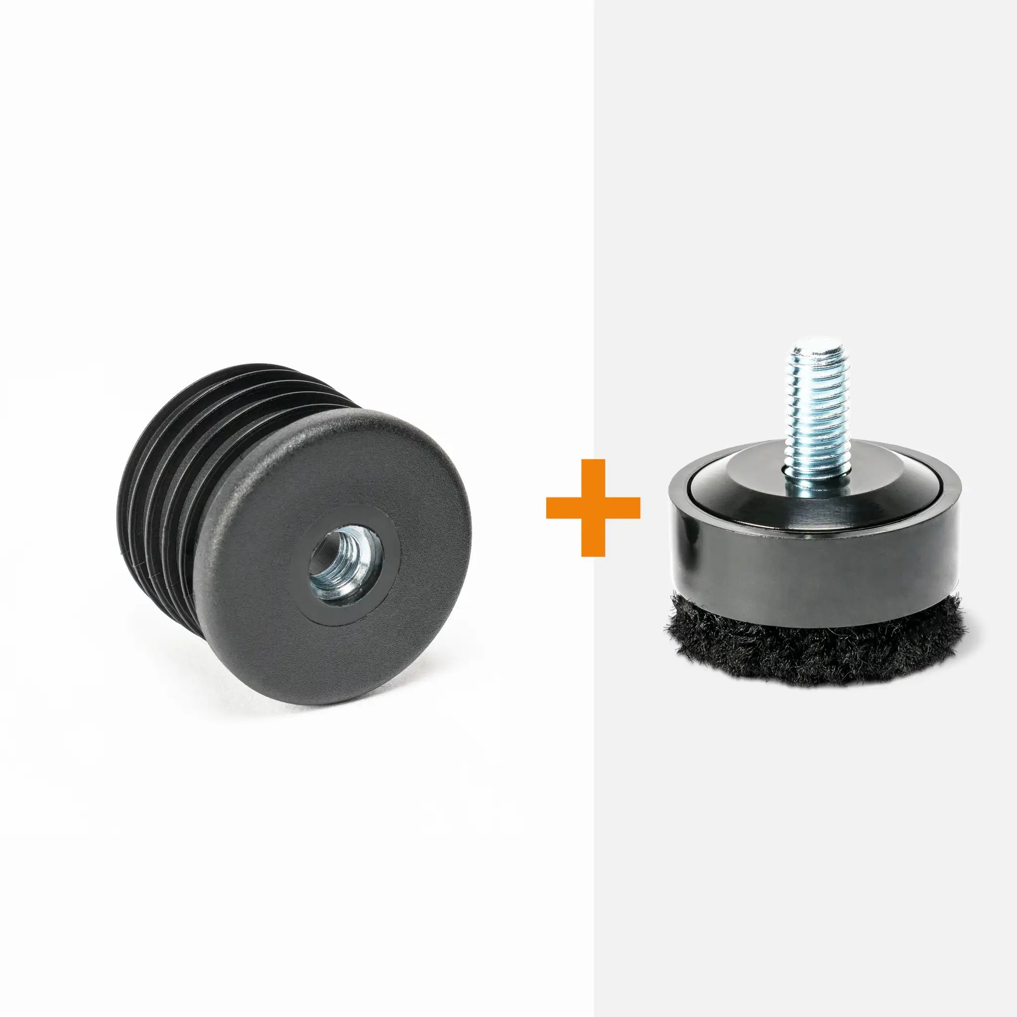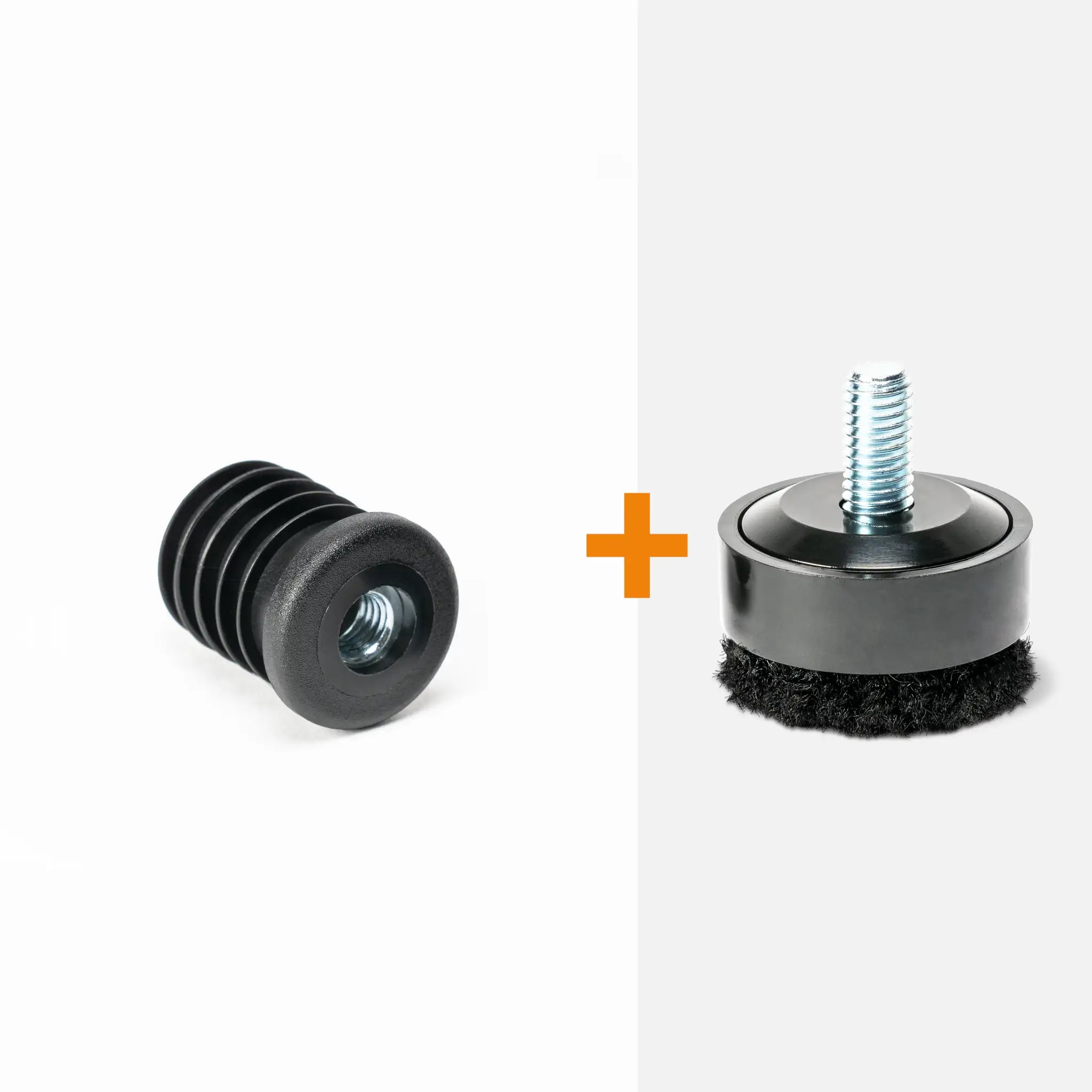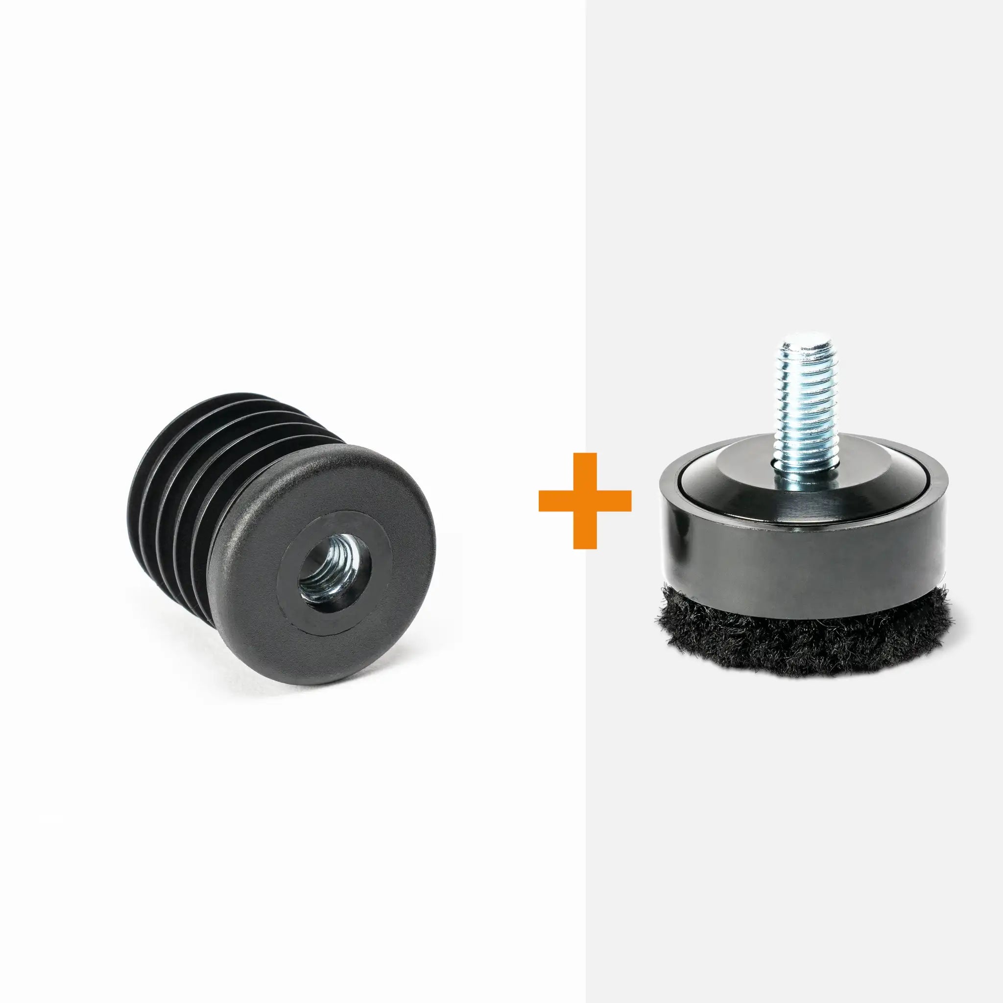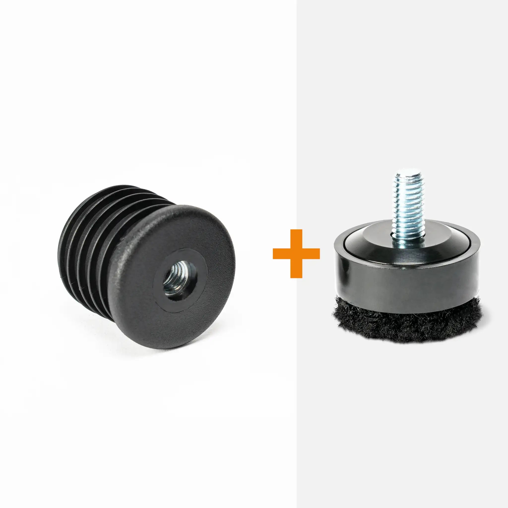 Runder Lamellenstopfen mit eingebautem Innengewinde M8, um runde Stahlrohrbeine mit unseren kratzerfreien Gewindegleitern nachzurüsten.