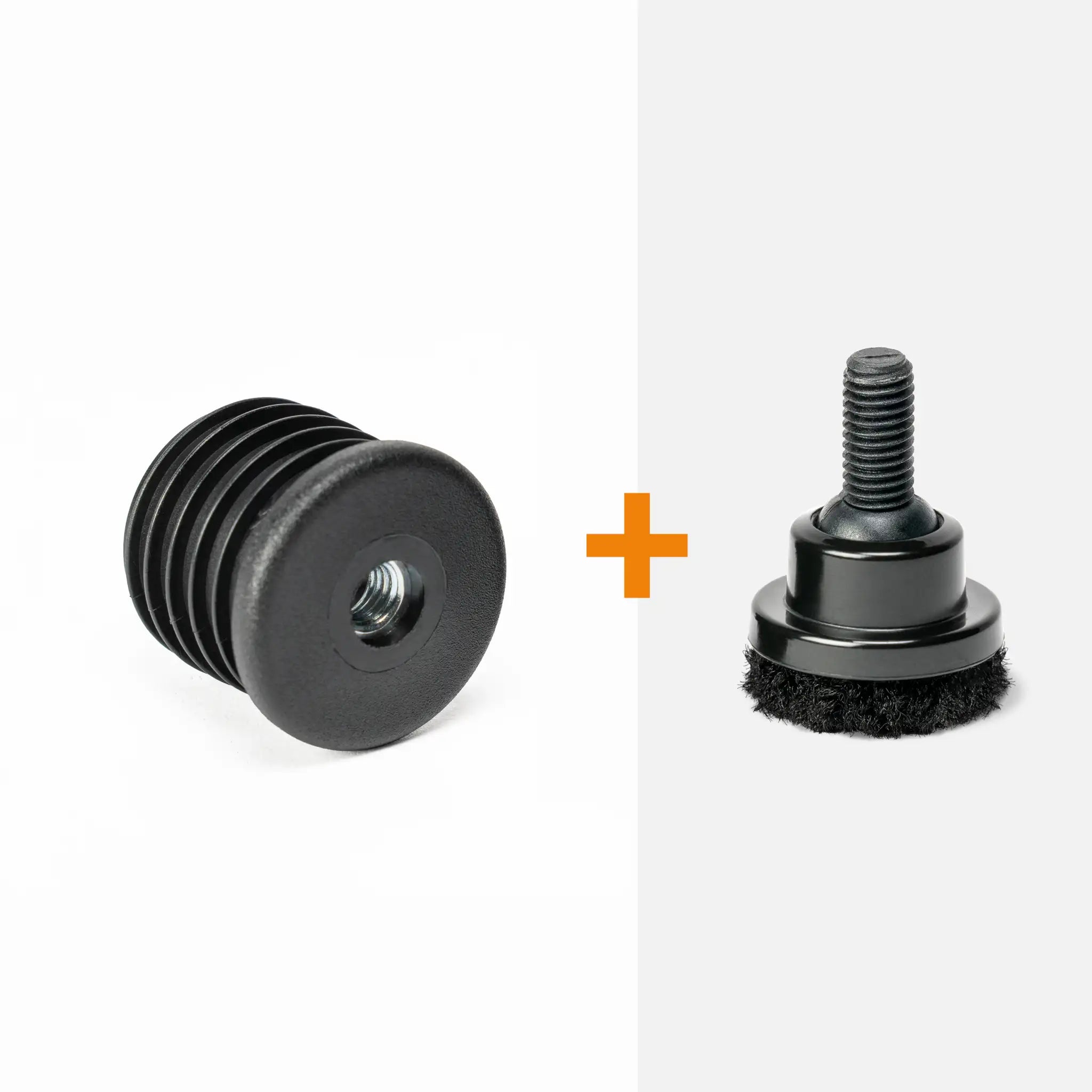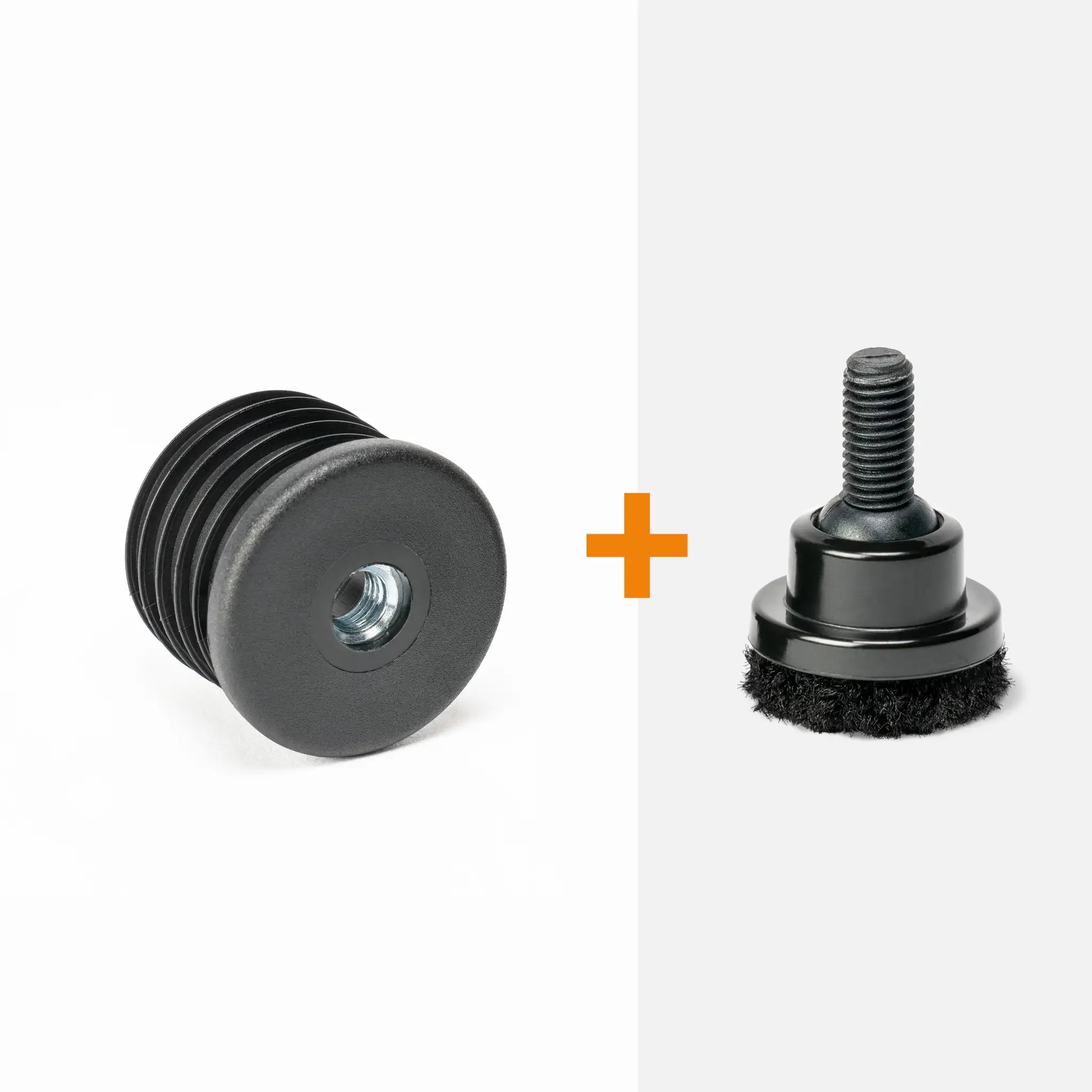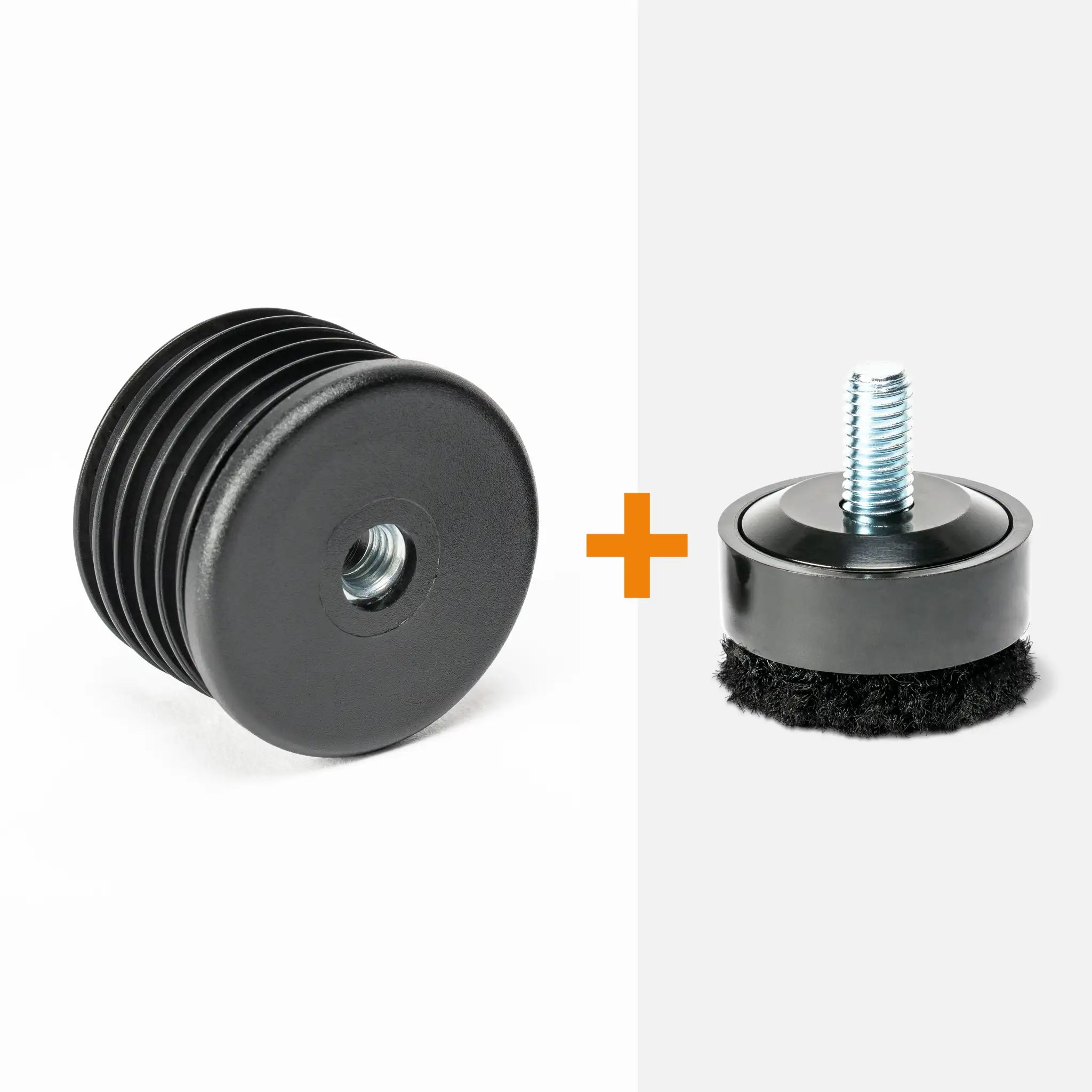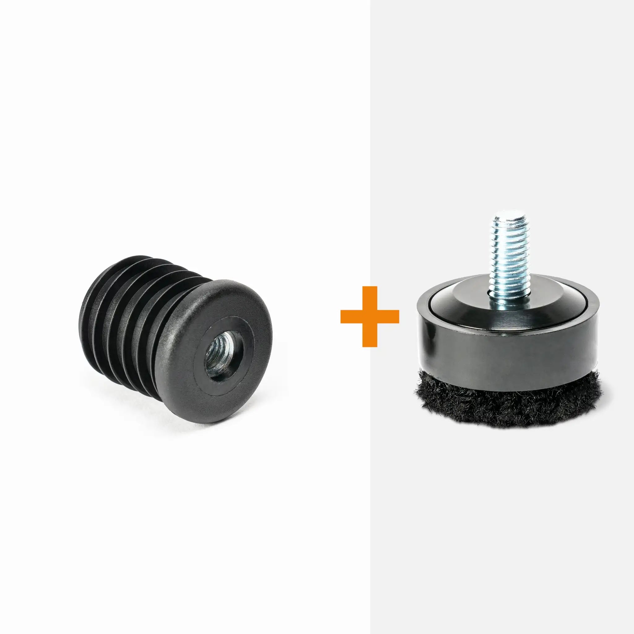 Runder Lamellenstopfen mit eingebautem Innengewinde M8, um runde Stahlrohrbeine mit unseren kratzerfreien Gewindegleitern nachzurüsten.