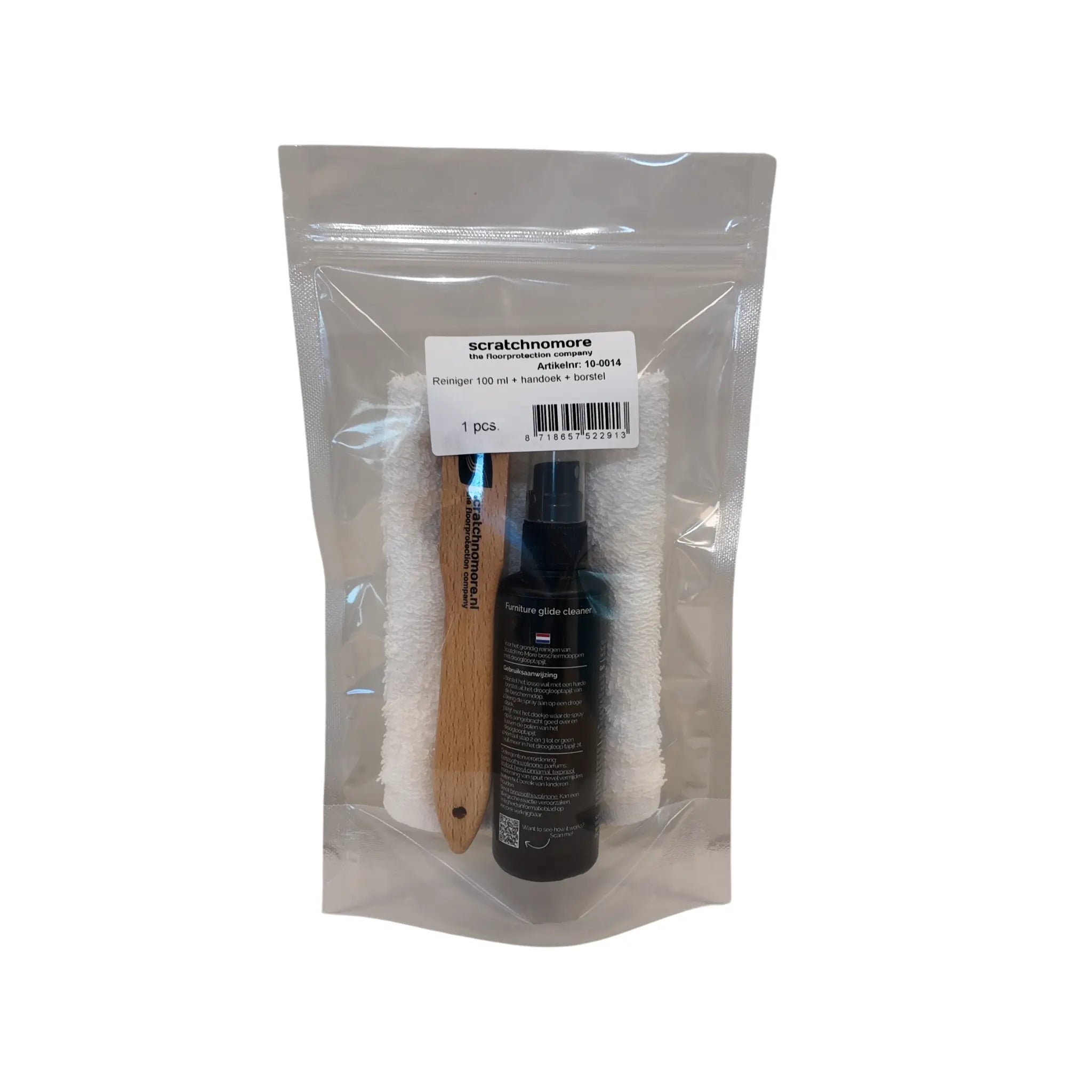 Houd je beschermdoppen schoon en in goede staat met deze handige reinigingsset. Bestaande uit een reinigingsmiddel, een zachte doek en een borstel. Het reinigingsmiddel is speciaal ontwikkeld voor het drooglooptapijt onder onze beschermdoppen en verwijdert gemakkelijk vuil en stof. Zo verleng je de levensduur van je beschermvoetjes en gaan je Scratch no More beschermdoppen nog langer mee.