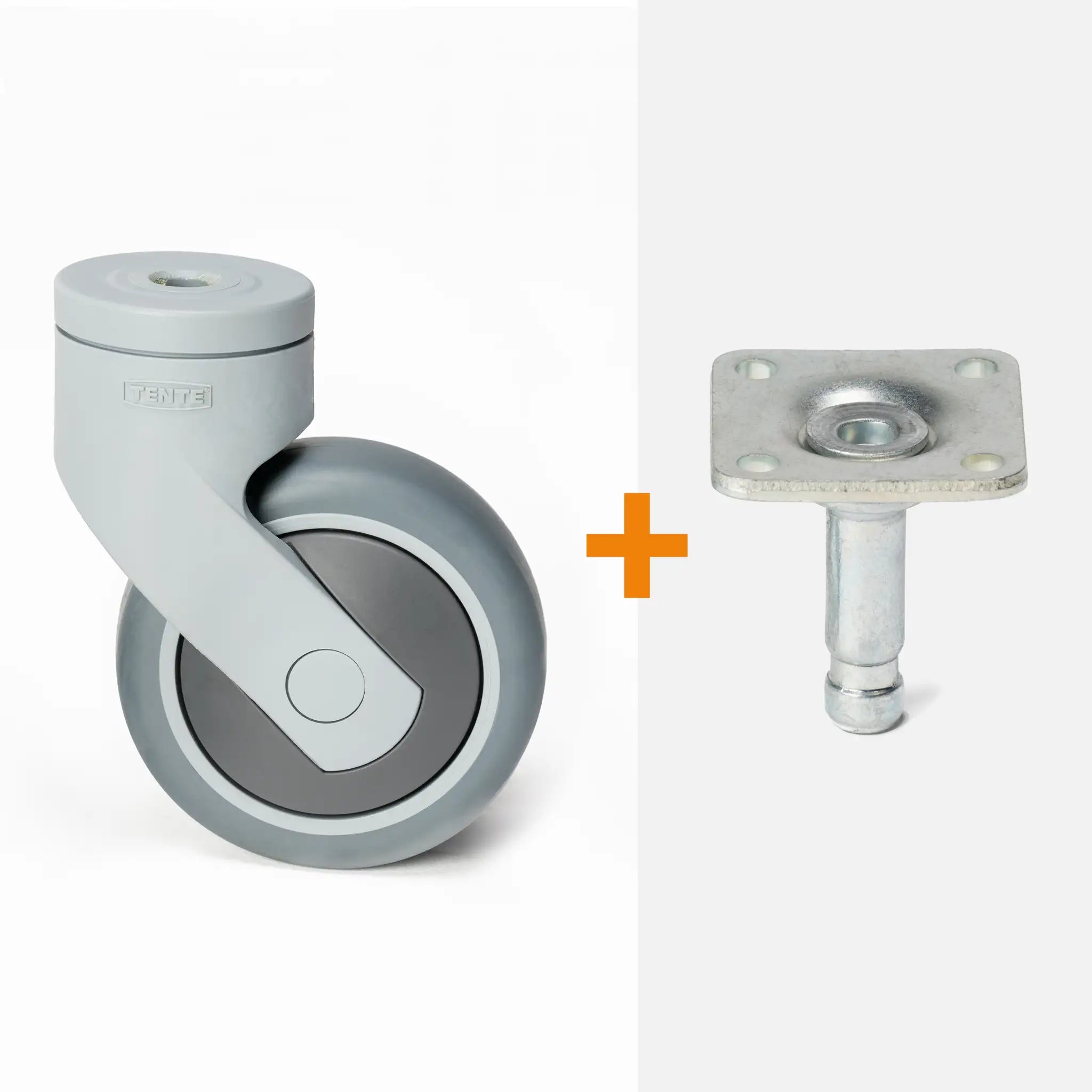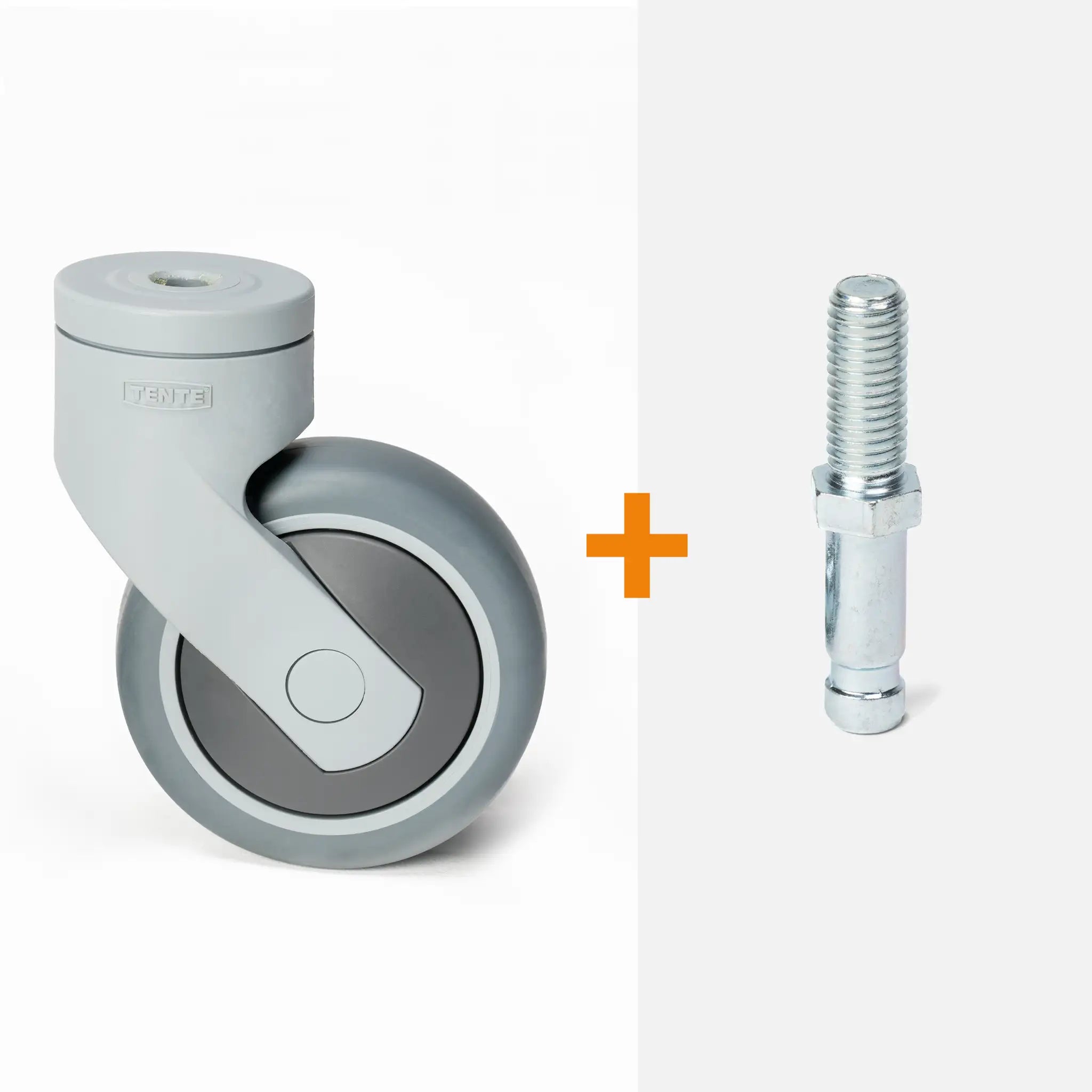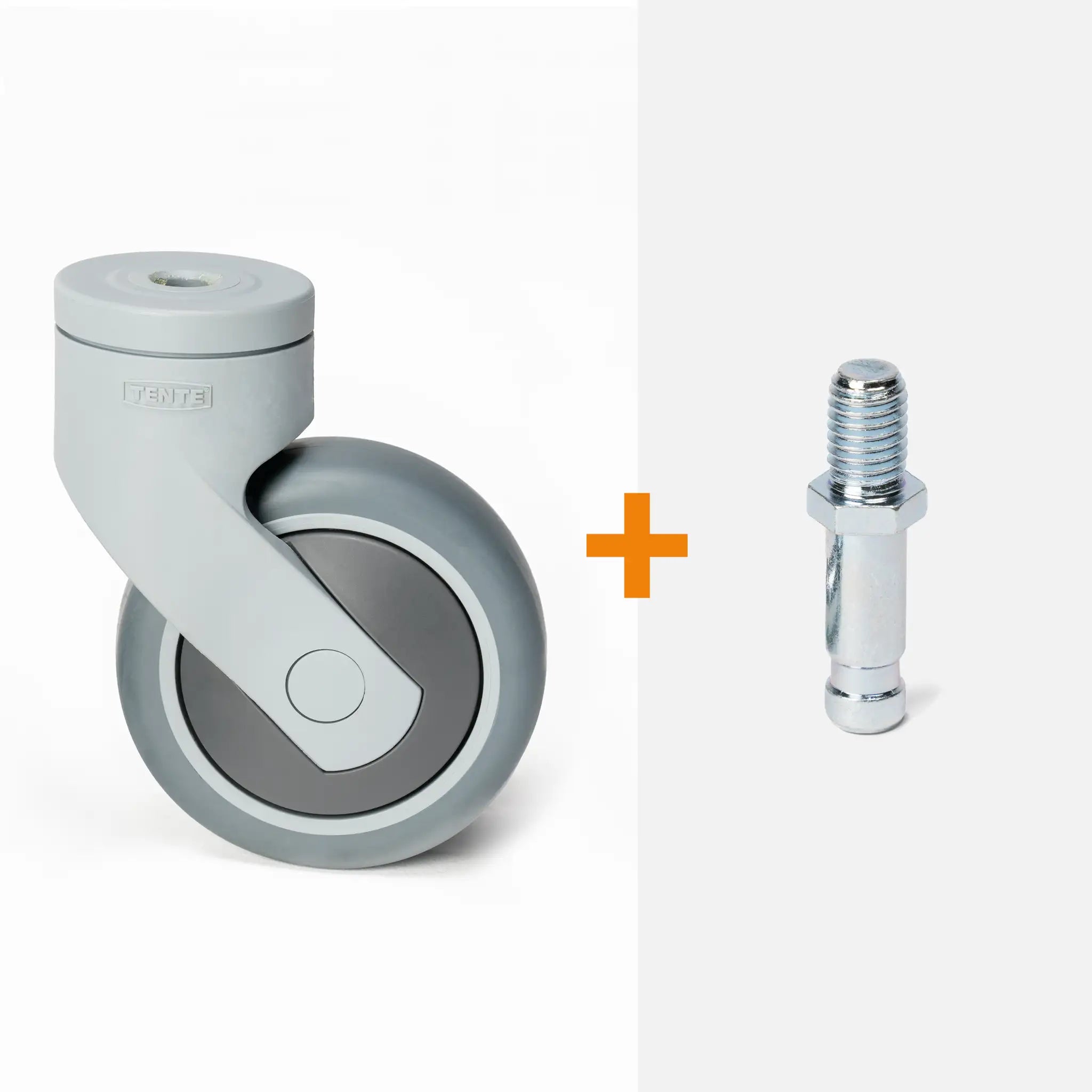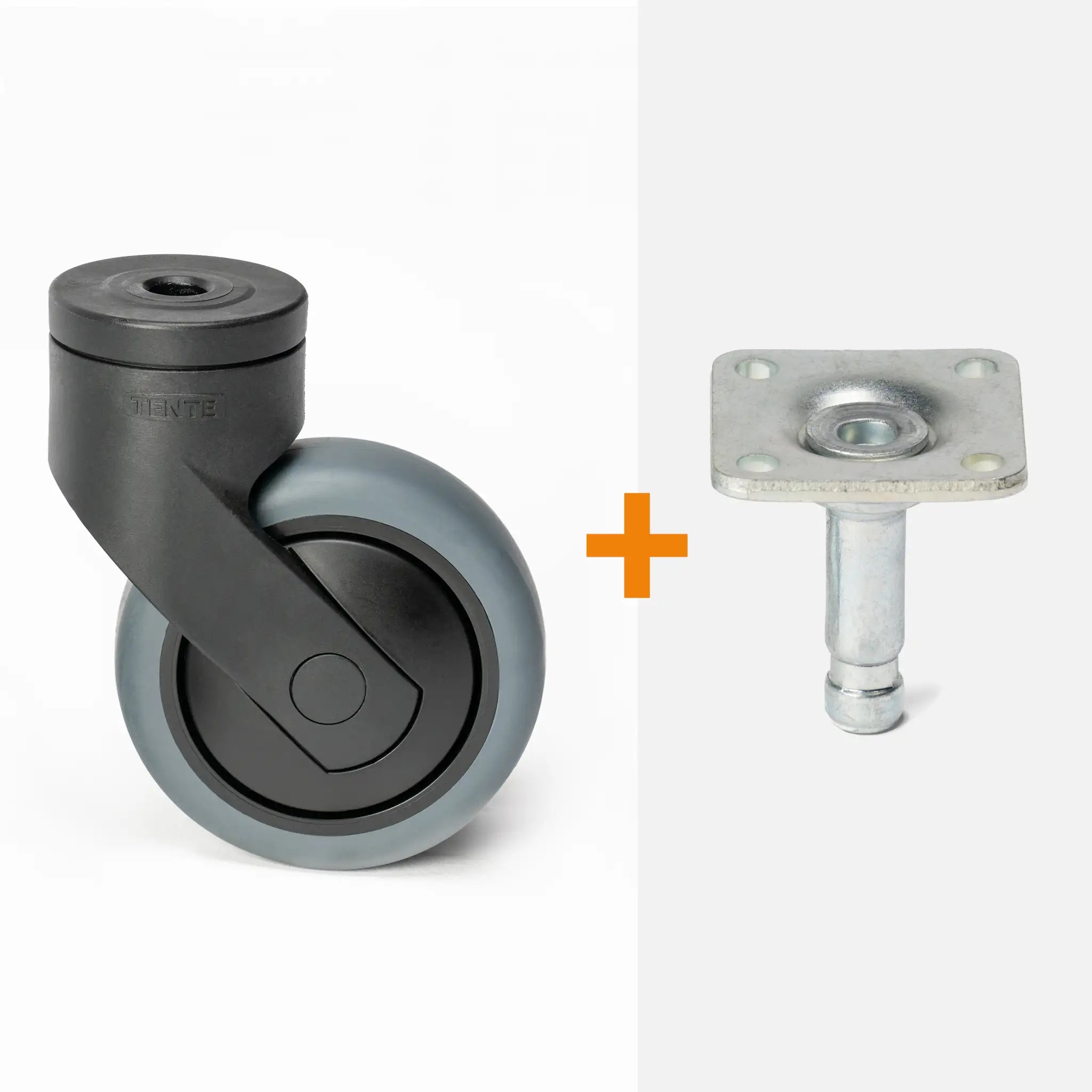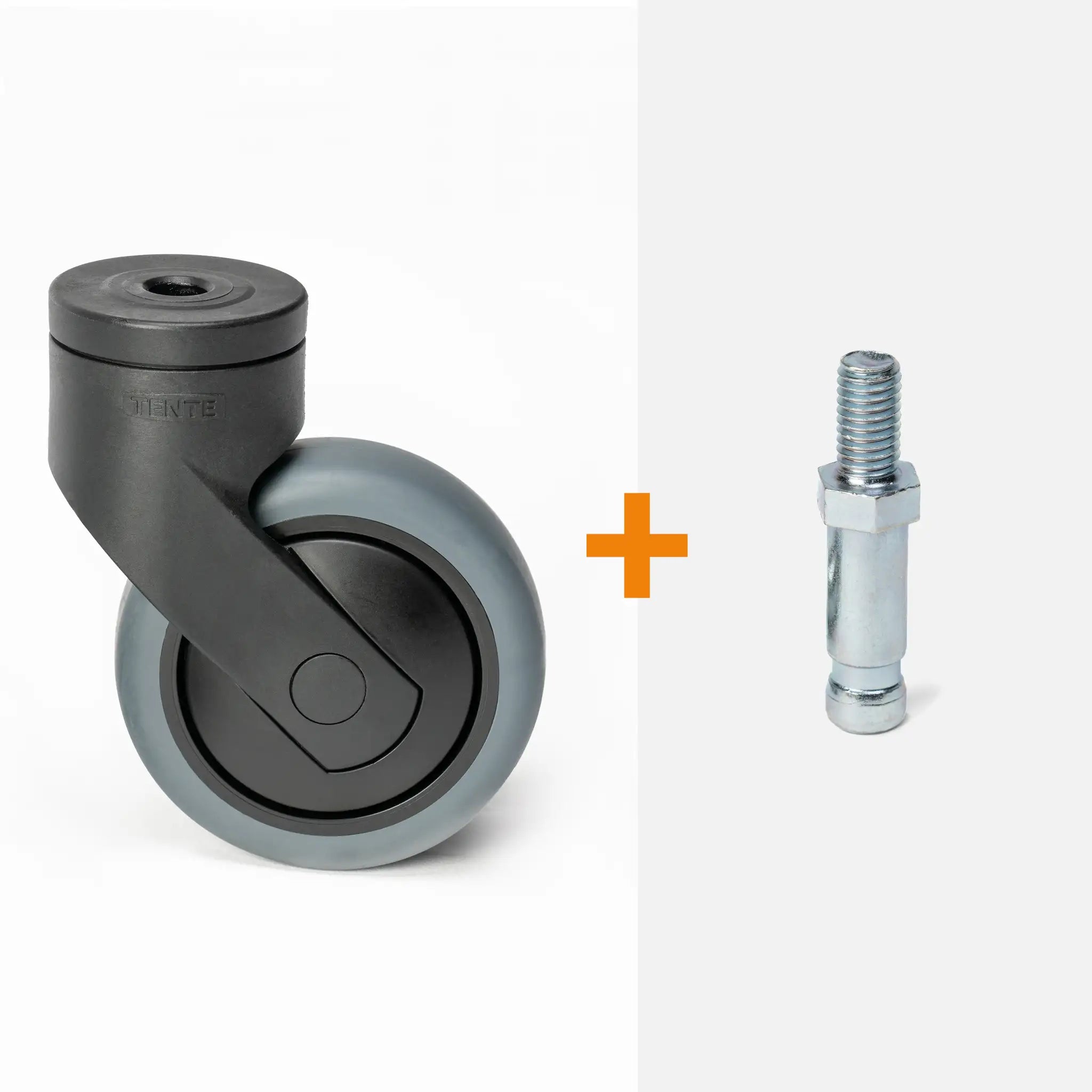 Design-Stuhlrolle mit 75 mm Durchmesser und Abdeckkappen, damit kein Schmutz zwischen die Rollen gelangt. Perfekt z. B. für den Einsatz in Friseursalon oder Zahnarztpraxis.